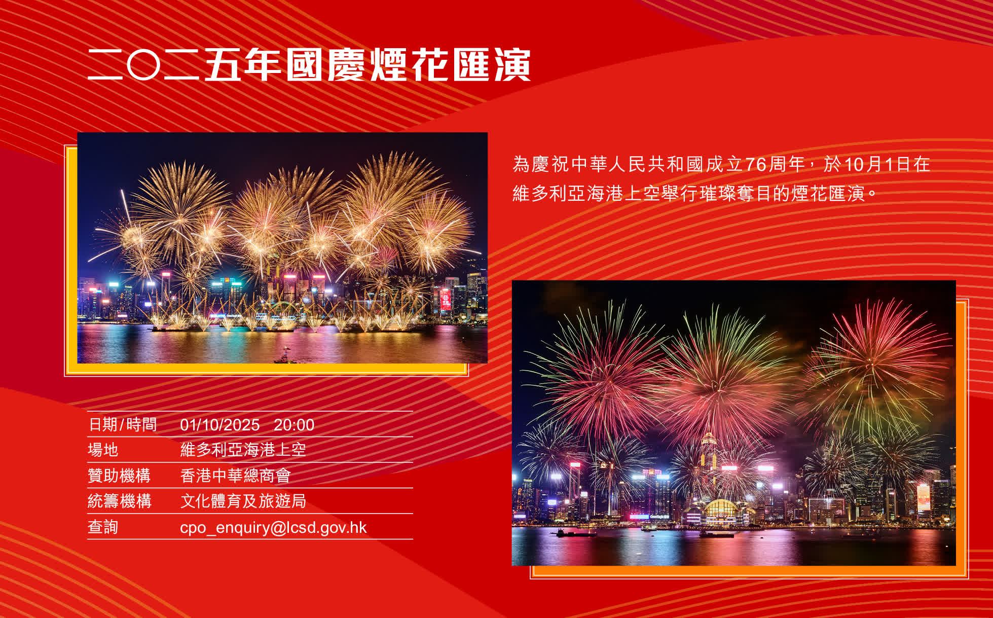 國慶節當日早上將舉行升旗儀式及國慶酒會,晚上維多利亞港上空會有大型煙花匯演,今年主題為「維港煙花 閃耀中華」,超過30000枚煙花屆時將照亮香江。10月2日晚上將舉行文藝晚會。