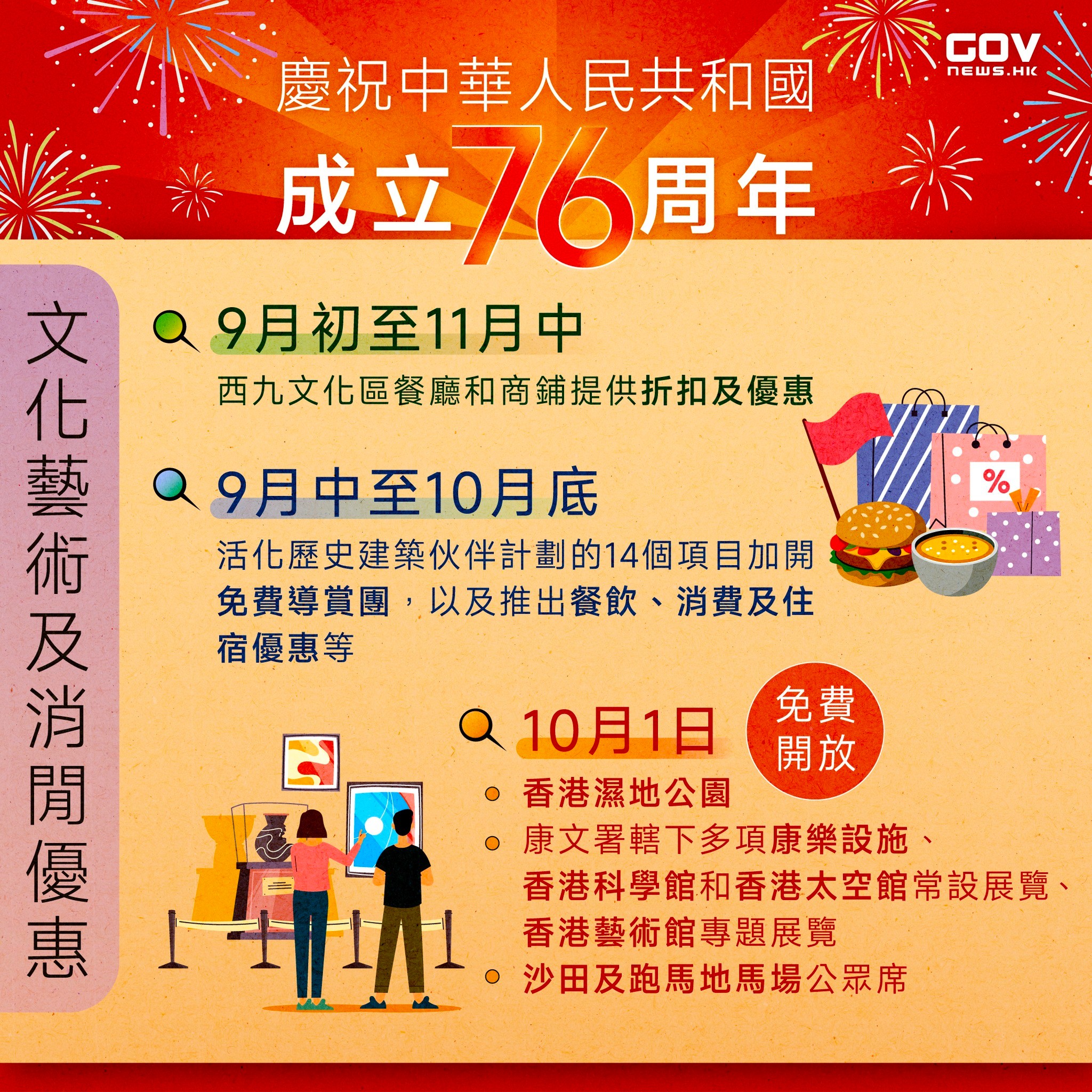 在文藝休閒方面,特區政府和多個機構將推出優惠活動。國慶當日,康文署多項設施免費開放。康文署轄下博物館及藝術空間免費入場(香港太空館天象廳節目除外)。全港商業電影院10月1日的電影票半價。
