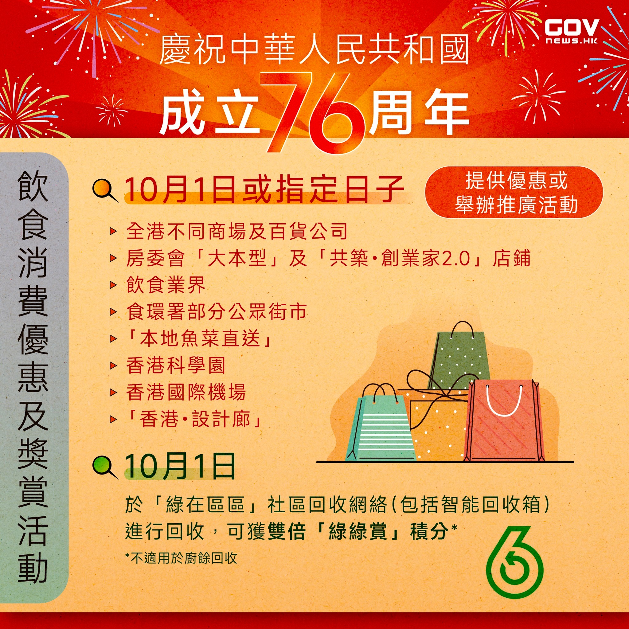 在飲食及消費方面,飲食業界及零售界也將推出各種優惠。多個商場及百貨公司推出購物及餐飲現金券、商戶禮券、折扣優惠、泊車優惠,以及大抽獎等。
