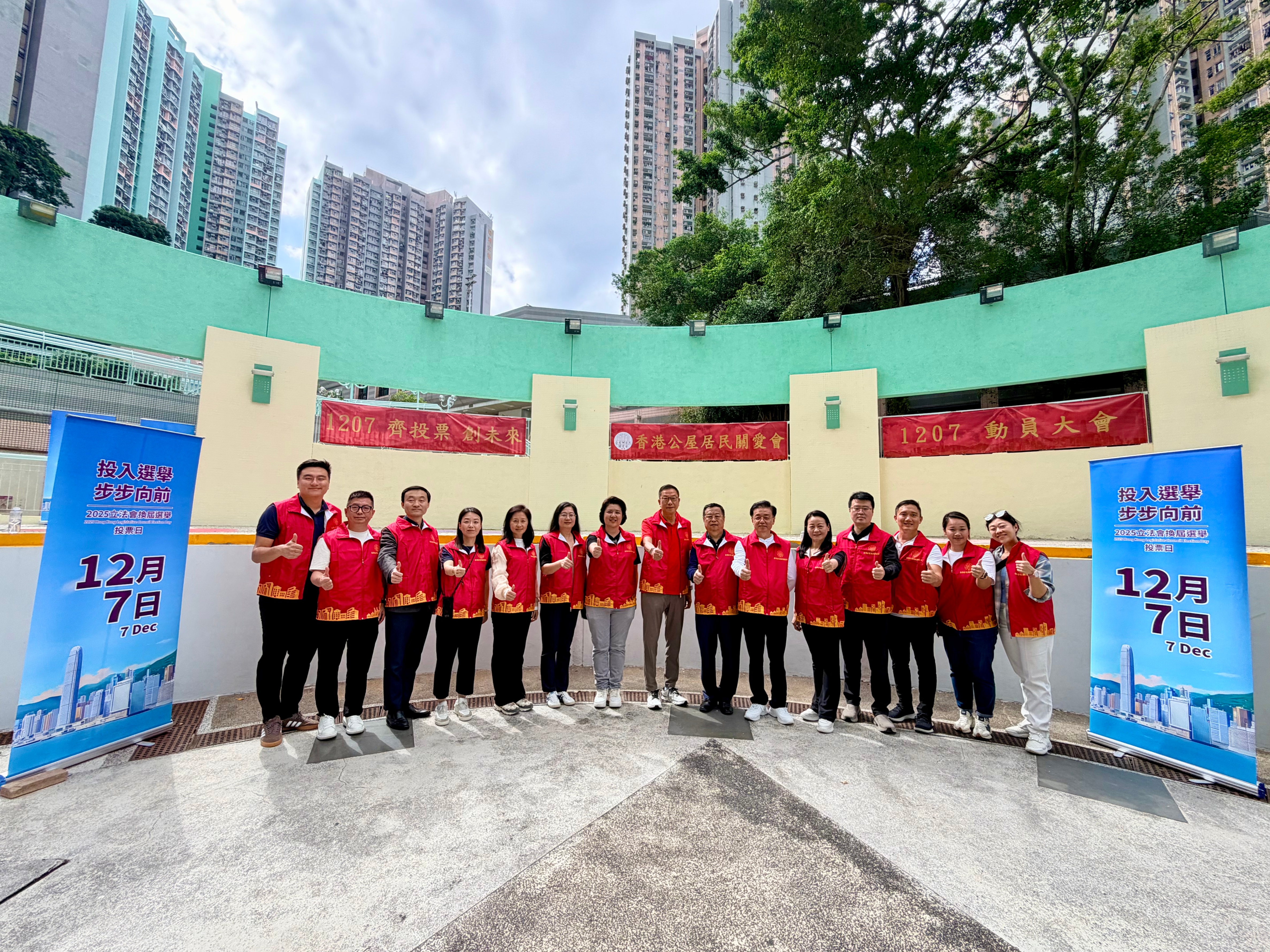 2025年11月8日,為積極響應香港第八屆立法會選舉,香港北京社團總會(以下簡稱「總會」)團體會員公屋居民關愛會(以下簡稱「關愛會」)於沙田馬鞍山利安邨露天劇場隆重舉辦「1207 齊投票 創未來」動員大會。總會會長、關愛會榮譽主席施榮懷,總會常務副會長、關愛會理監事會會長李冠誼,總會常務副會長、關愛會董事會主席王力平,總會司庫、關愛會理監事會監事長林靄欣,總會社團活動委員會主任、關愛會理監事會副會長洪定騰,總會婦女工作委員會主任馬春玲,總會工作委員會副主任、關愛會理監事會副會長陸茵,總會工作委員會副主任、關愛會理監事會副會長兼秘書長宋冰冰,總會工作委員會副主任、關愛會理監事會副監事長徐建,總會內地事務處副主任朱龍斌,關愛會總幹事李林昌及關愛會各辦事處主任江偉鵬、吳有根、陳德立、蔡偉浩、文潤華、張燕婷、盧楚穎出席活動並分別發言,現場逾300人參加。
