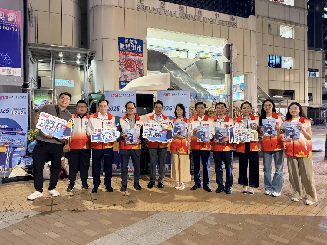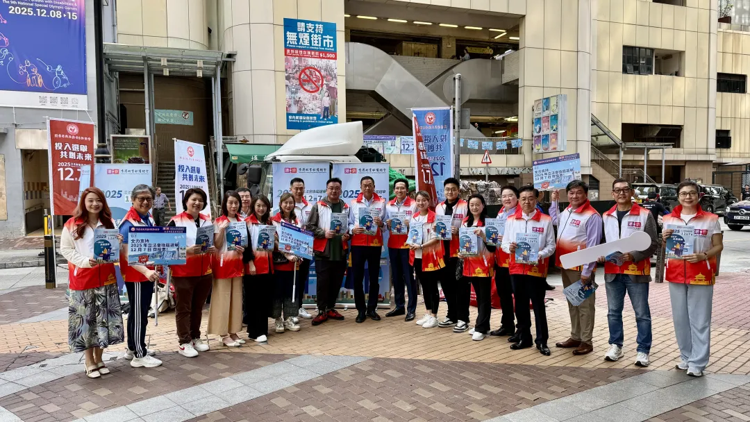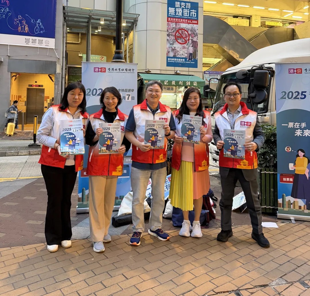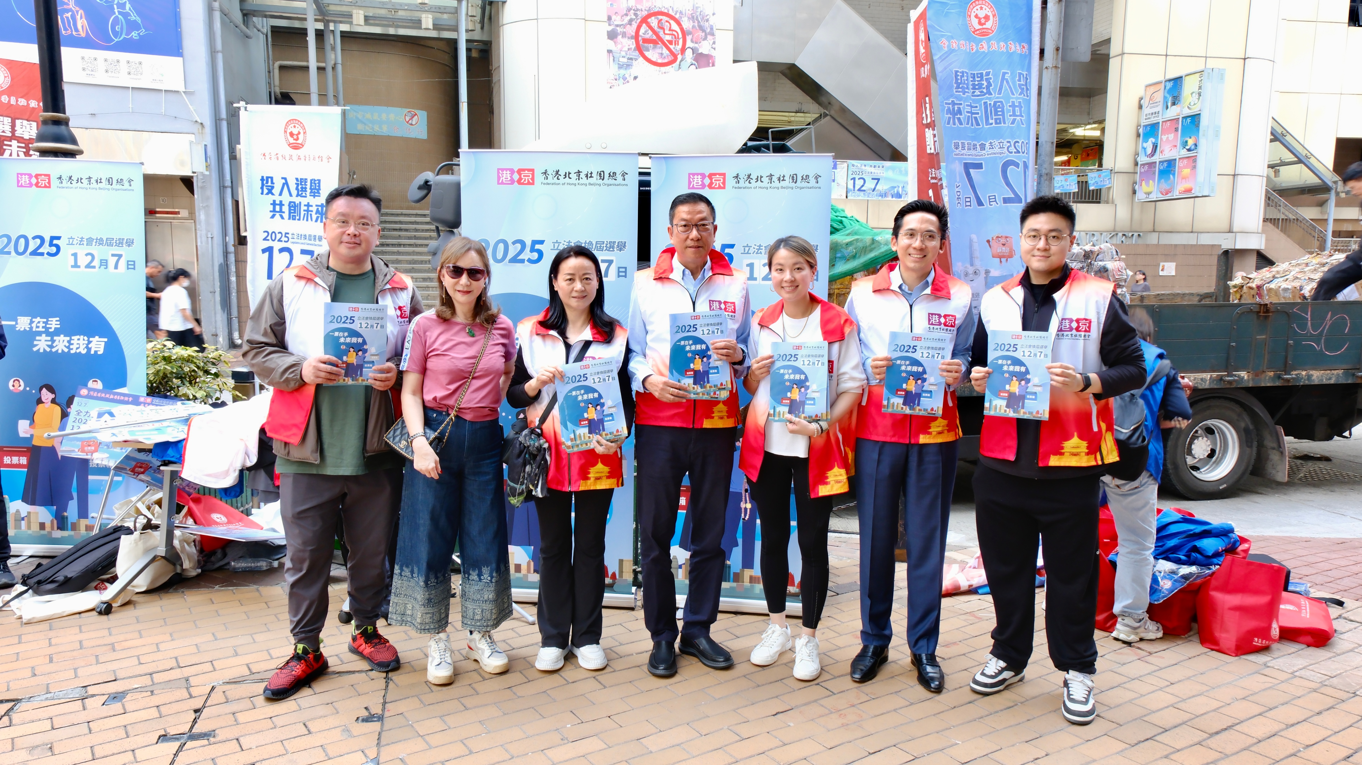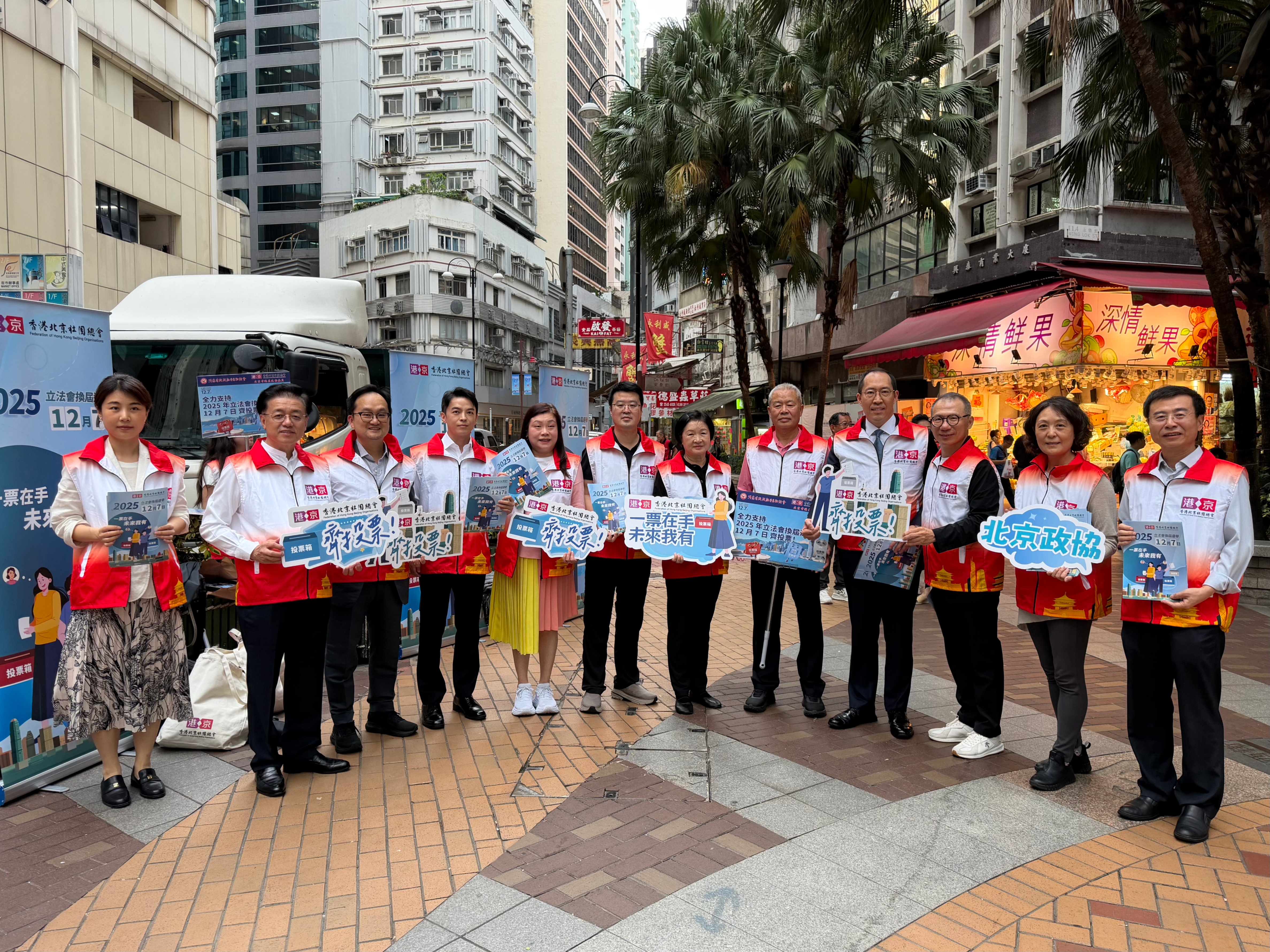 香港特別行政區第八屆立法會選舉將於2025年12月7日舉行。11月10日,香港北京社團總會到上環設街站,會長施榮懷,常務副會長楊莉珊、李家誠、黃永光、李冠誼,司庫林靄欣,義務法律顧問德立華,對外聯絡委員會主任吳志龍,社團活動委員會主任洪定騰,專業人士委員會主任盧煜明,婦女工作委員會主任馬春玲,會員發展委員會副主任劉海明,對外聯絡委員會副主任刘辰瑶,社團活動委員會副主任劉珉宏,專業人士委員會副主任李惠光,義工團副主任徐建,內地事務處副主任朱龍斌,常務理事王宏濤、向均羚、何建宗、邵信明、徐生恆、郭基泓、陳美寳、陈愈靈、凌俊傑、張瑞祺、張雅麗、黃大焜、程雁、曾安業、曾順福、蔡志婷、蔣東強、廖井梅、劉德基、劉澤星,理事王峽、方璇、李軒葆、李嘉彥、李哲卉、吳煒、林強、林憬怡、徐嘉琦、崔劍、曾倩冰、黄健華、駱菁雯,會員王維巍、張建偉等人參加活動並在街頭派發傳單,呼籲市民12月7日踴躍投票。
