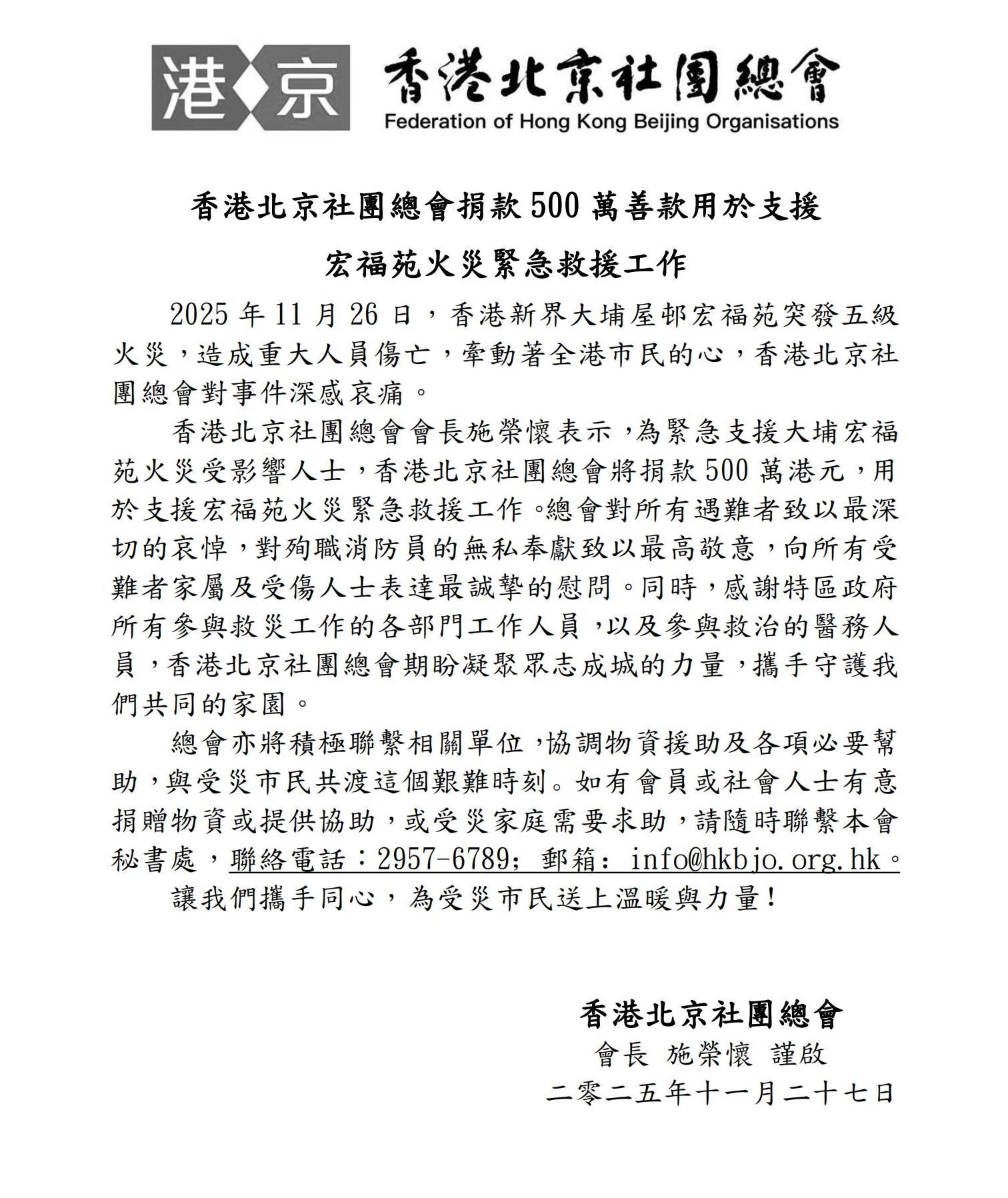 香港北京社團總會捐款500萬善款用於支援宏福苑火災緊急救援工作